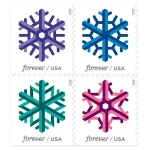 Celebrate the joys of a winter snowfall with Geometric Snowflakes, four colorful new Stamps from the U.S. Postal Service. Each of the four Stamps depicts a different snowflake. When it snows, untold millions of ephemeral ice crystals form unique patterns that are as stunning in their complexity as they are fleeting.