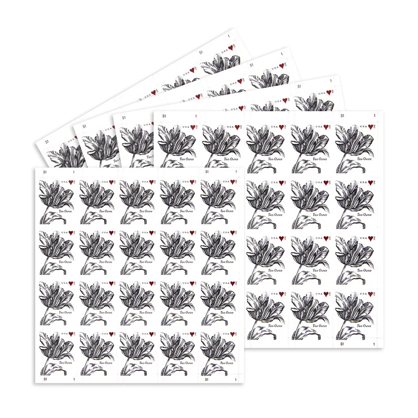 The tulip was chosen for the 2015 Weddings two-ounce stamp because it is a traditional declaration of devotion. This stamp was issued for use on wedding invitations and greeting cards that require extra postage. A coordinating Vintage Rose Forever stamp was also released for use on wedding RSVP cards and thank you notes.